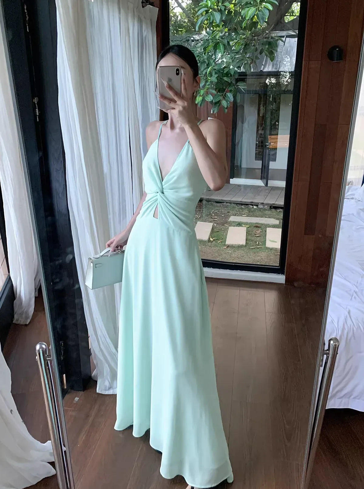 Dreamy prom dress features a flattering A-line silhouette that flows gently from the waist, creating a romantic, ethereal drape. The plunging V-neckline is framed by delicate crisscross spaghetti straps that tie at the back for a customizable fit, while a twisted front detail with a subtle keyhole cutout adds texture and allure. The lightweight, flowy maxi skirt cascades to the floor, moving beautifully with every step, and the soft mint green hue exudes freshness and elegance.