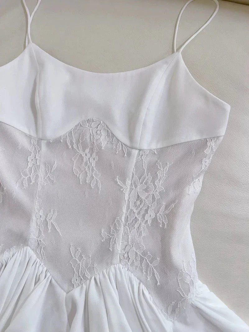 Ethereal A-line Square Neck Sleeveless Lace Ruffle White Mini Homecoming Dress is crafted from luxe satin and delicate lace, creating a romantic, ballet-inspired silhouette. The square neckline is framed by thin spaghetti straps, while the sheer lace bodice adds soft texture and a subtle, dreamy allure. The A-line mini skirt features a multi-layered ruffle hem that sways gracefully with every step, balancing youthful whimsy with elegant tailoring.