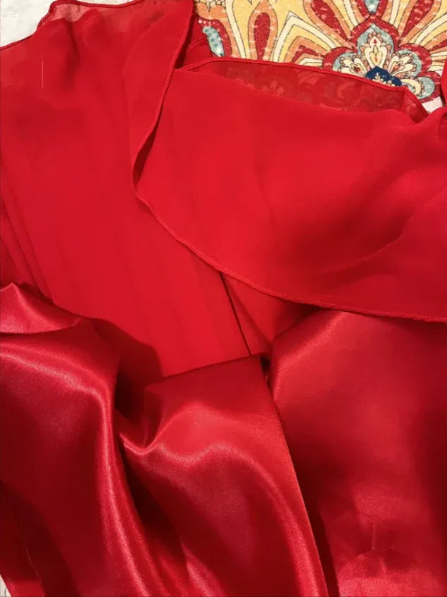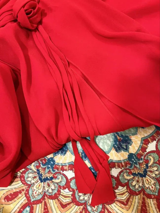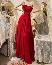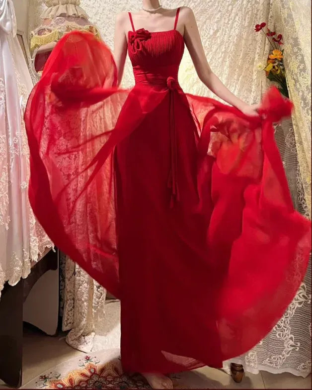 Glamorous prom dress features a flattering A-line silhouette that flows from the waist into a voluminous, lightweight maxi skirt, creating dramatic movement with every step. The square neckline is framed by slim spaghetti straps, while the ruched bodice adds texture and cinches the waist for a tailored fit. A delicate fabric flower adorns the chest, and a self-tie waist detail enhances your curves. The vibrant red hue and sheer, flowy skirt exude confidence and romance, making it a standout piece.