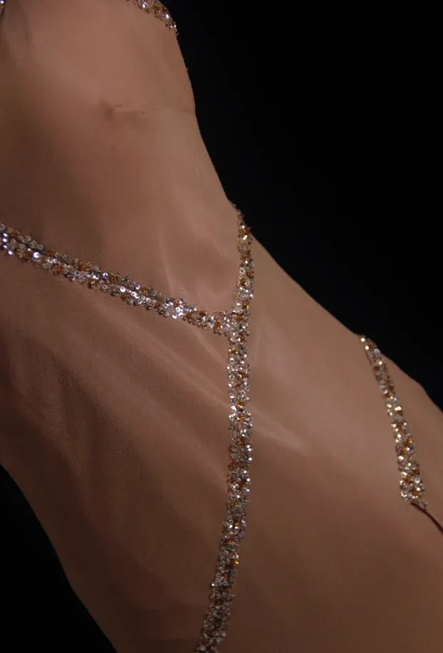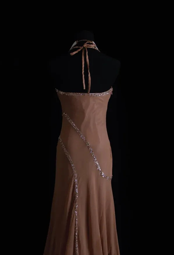 Luxurious prom dress features a sleek trumpet silhouette that hugs your curves before flaring gently from the knee, creating a red-carpet-ready look. The halter neckline is adorned with sparkling champagne-hued beading that follows diagonal lines across the bodice and skirt, catching the light with every movement. The lightweight, flowy maxi skirt cascades to the floor with an asymmetric drape and subtle train, while the halter tie-back ensures a customizable fit. The soft champagne hue and delicate beading exude timeless elegance and glamour.