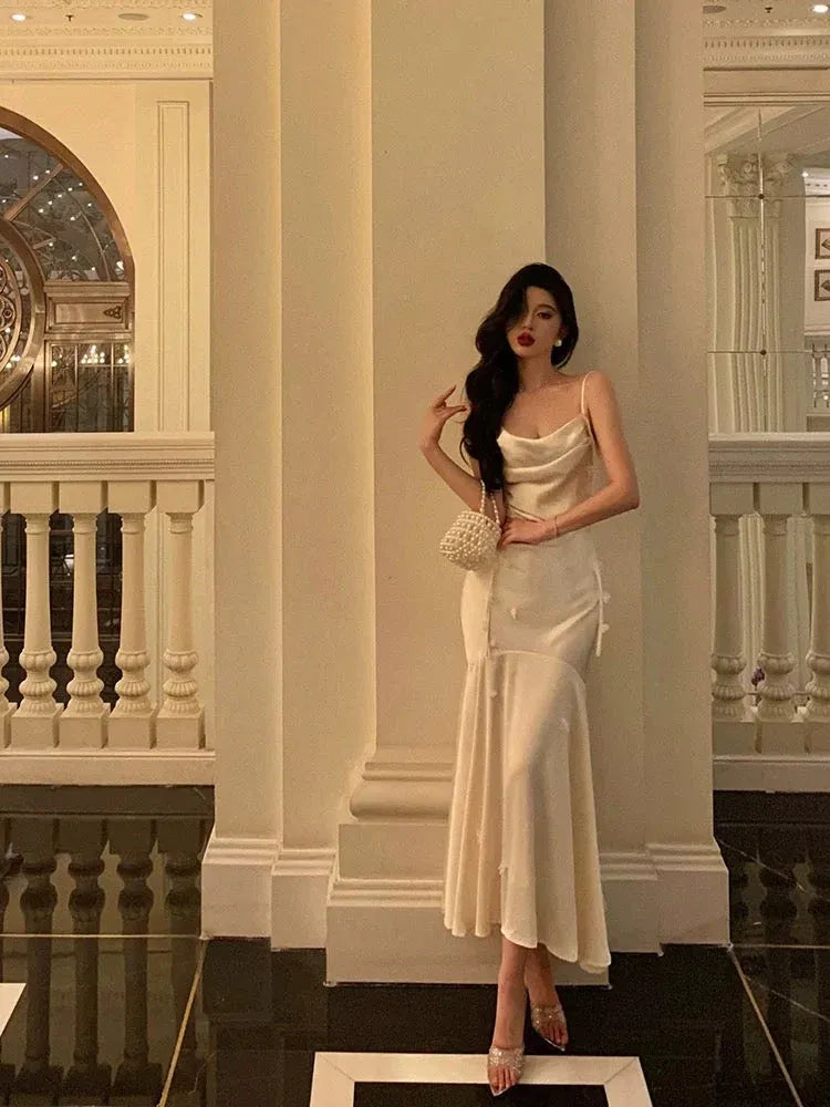 Stunning prom dress features a luxuriously smooth satin fabric that drapes beautifully, creating an elegant silhouette. Its mermaid-style skirt hugs your curves and flares gently at the bottom, while the delicate cowl neck adds a touch of timeless glamour. The sleeveless design keeps it light and refined, making it perfect for prom nights, weddings, gala events, or any formal occasion where you want to stand out. The soft ivory hue exudes sophistication, ensuring you look effortlessly chic and feel confident all night long. It is ready to ship, so you can receive your dream dress in no time and shine like the star you are.