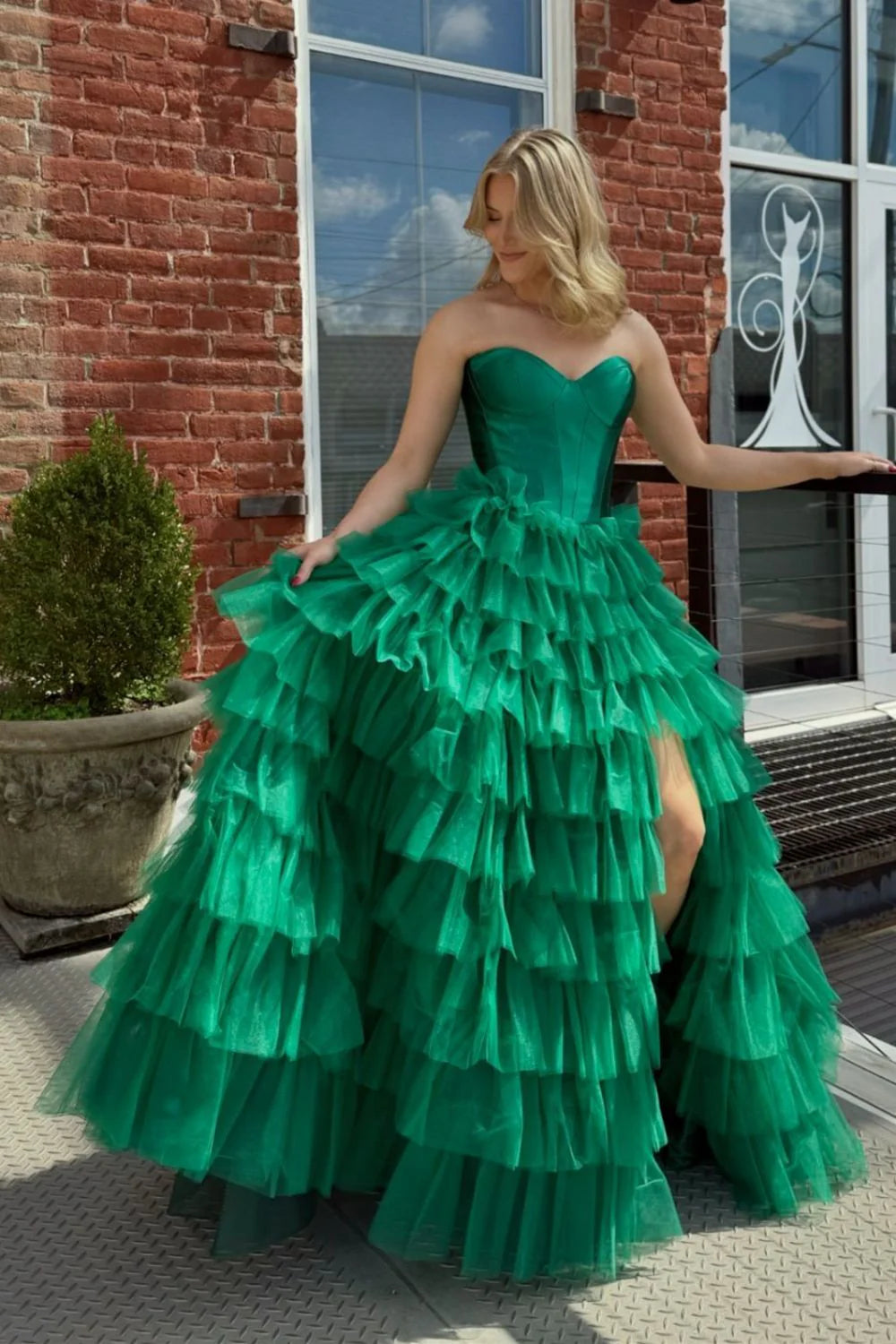 Princess-style A-line prom dress in a stunning green color features a sweetheart neckline that beautifully frames the collarbone. The skirt is adorned with abundant ruffles and tiered layers, creating a voluminous and dreamy look, and there's a stylish slit for added grace. The structured bodice ensures a flattering fit.