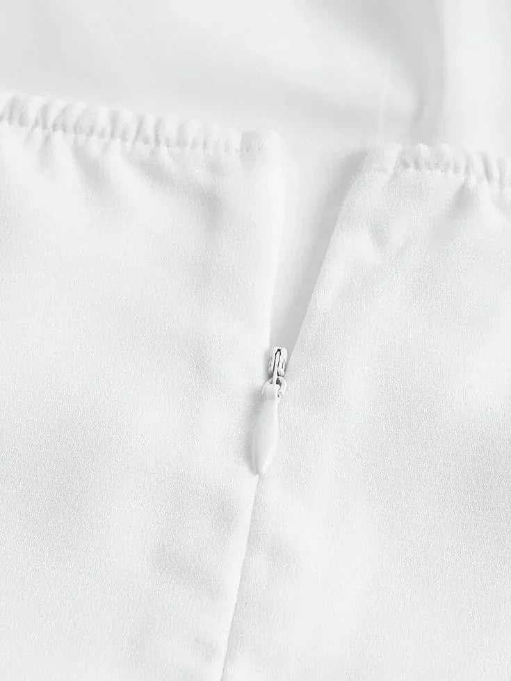 Romantic A-line Cowl Neck Sleeveless Ruffle White Mini Homecoming Dress is crafted from lightweight, flowy fabric that drapes softly against your skin. The cowl neckline creates a soft, romantic focal point, while the fitted bodice cinches your waist for a flattering silhouette. The A-line mini skirt features a double ruffle hem that adds playful volume and movement, balancing elegant tailoring with a youthful, whimsical vibe.