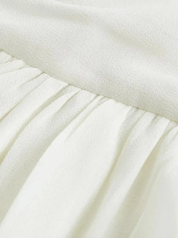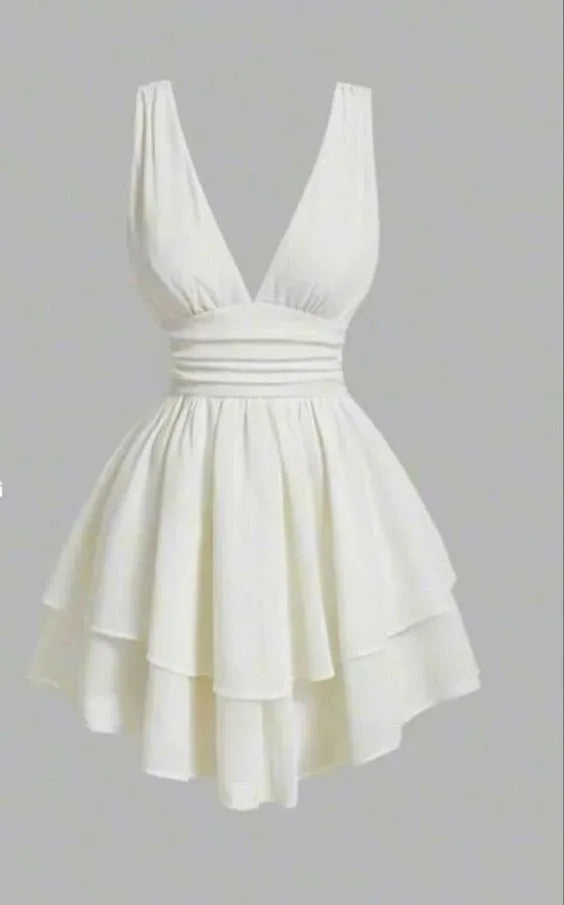 Romantic A-line Deep V Neck Sleeveless Ruffle Ivory Mini Homecoming Dress is crafted from lightweight, flowy fabric that drapes softly against your skin. The plunging deep V-neckline creates a striking focal point, while the ruched waistband cinches your silhouette for a flattering fit. The A-line mini skirt features a double ruffle hem that adds soft volume and movement, balancing elegant tailoring with a playful, feminine vibe.