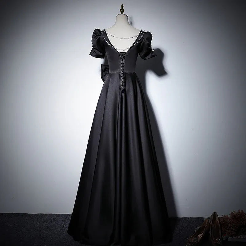 Charming ballgown evening dress blends vintage romance with modern elegance: crafted from sleek black satin, it features a sweetheart neckline, puffed short sleeves (adorned with pearl details), a lace-up back, a dramatic waist bow, and a voluminous floor-length ballgown skirt. The satin’s subtle sheen elevates the silhouette, while the bow adds playful, feminine charm.