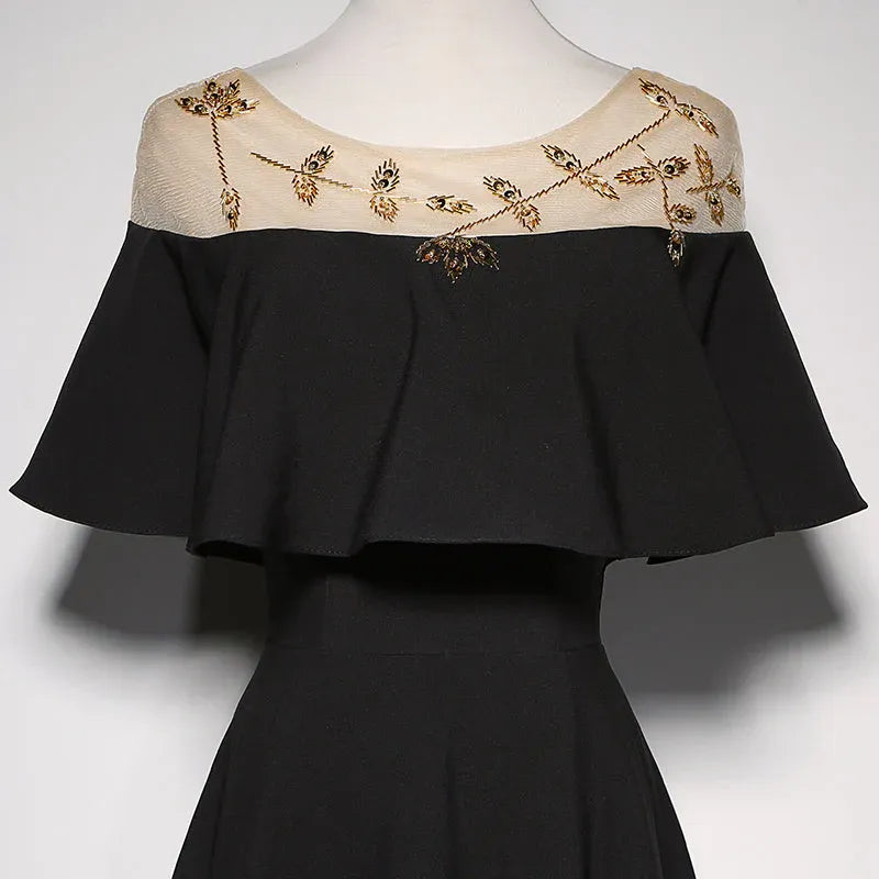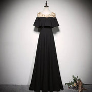 Chic A-line evening dress blends modern elegance with delicate detail: crafted from smooth black fabric, it features an off-shoulder neckline (with a beige embroidered overlay), ruffled cap sleeves, a corset-style lace-up back, and a floor-length A-line skirt. The embroidered accents add subtle luxury, while the black hue feels timeless yet sleek.