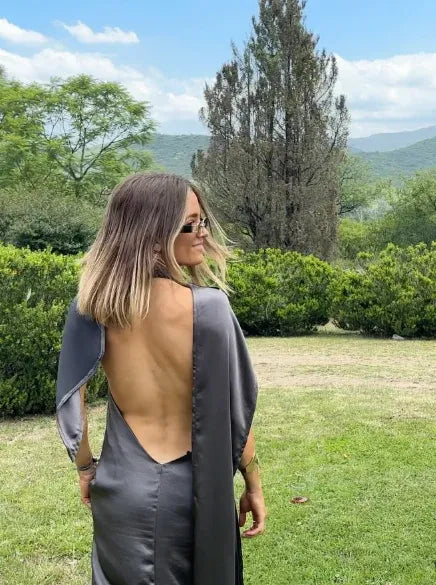 Chic A-line evening dress blends effortless elegance with versatile charm: crafted from smooth charcoal satin, it features spaghetti straps, a square neckline, a deep open back, and an attachable satin cape (for convertible styling). The satin’s subtle sheen adds refinement, while the cape lends polished layering.