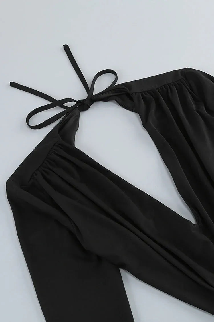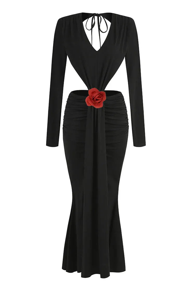 Edgy Black Evening Dress features a bold mermaid silhouette, paired with a deep V-neckline and sleek long sleeves that balance allure and sophistication. Standout details include dramatic cutouts (front and back, with a tie-back closure) and a ruched waist adorned with a vivid red rose accent—adding a striking pop of color to the minimalist black crepe fabric. A high thigh slit ensures ease of movement while amplifying the gown’s modern edge.