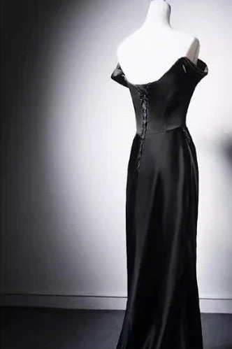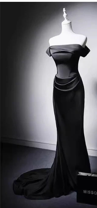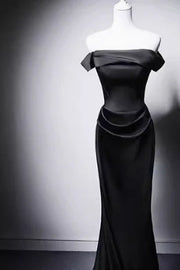 Elegant Mermaid Off-the-shoulder Pleated Lace up Satin Black Evening Dress is a showstopper. It features a mermaid silhouette that hugs the body and flares at the bottom, an off-the-shoulder neckline with pleated detailing, and is crafted from luxurious satin in a timeless black hue. The dress boasts a lace-up back design and a subtle train, adding a touch of sophistication and allure.