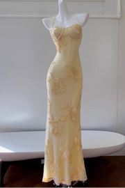 Elegant Sheath Spaghetti-Strap Applique Chiffon Yellow Evening Dress is a true standout. It features a sheath silhouette that hugs the body gracefully, delicate spaghetti straps, and exquisite floral applique detailing. Crafted from airy chiffon in a soft yellow hue, it also boasts an alluring criss-cross lace-up back design.