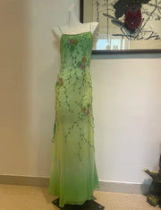 Elegant Vintage Sheath Spaghetti Strap Beaded Chiffon Green Evening Dress is a captivating choice. It features a sheath silhouette that hugs the body gracefully, delicate spaghetti straps, and is adorned with intricate beaded floral and vine detailing. Crafted from airy chiffon in a soft green hue, it offers a vintage-inspired charm with a flowing drape.