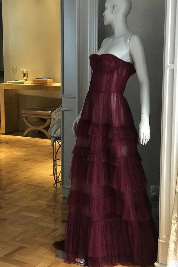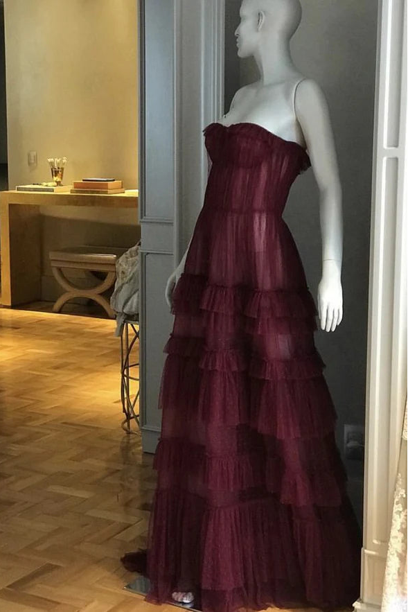 Glamorous A line Sweetheart Tulle Burgundy Long Evening Dress Prom Dress is a captivating choice. It features an A-line silhouette for a graceful, flowing fit, a sweetheart neckline, and is crafted from layers of airy burgundy tulle. The dress boasts tiered ruffle detailing and a tailored bodice, adding a touch of sophistication and romance.