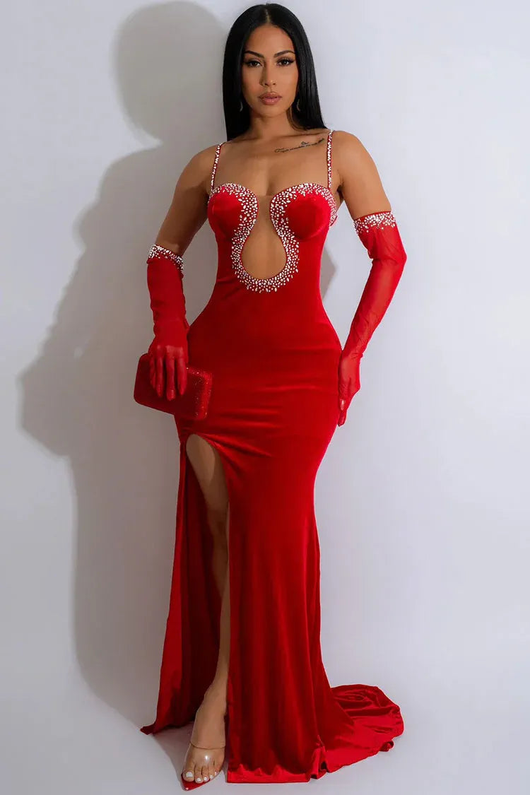 Glamorous Red Evening Dress features a form-fitting mermaid silhouette, delicate spaghetti straps (trimmed with crystals), and a bold cutout bodice (adorned with sparkling embellishments). Crafted from lush velvet, the floor-length skirt includes a thigh-high slit and subtle train, balancing luxury with modern allure.