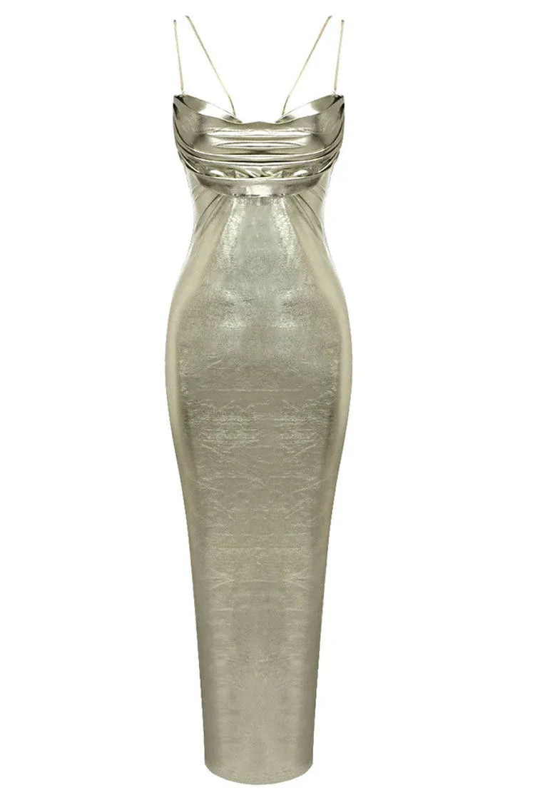 Glamorous Silver Evening Dress features a figure-hugging mermaid silhouette, paired with delicate spaghetti straps, a ruched bodice, and a high side slit. Crafted from lustrous metallic fabric, the floor-length gown catches light brilliantly, while the sleek design exudes modern luxury in formal-casual settings.