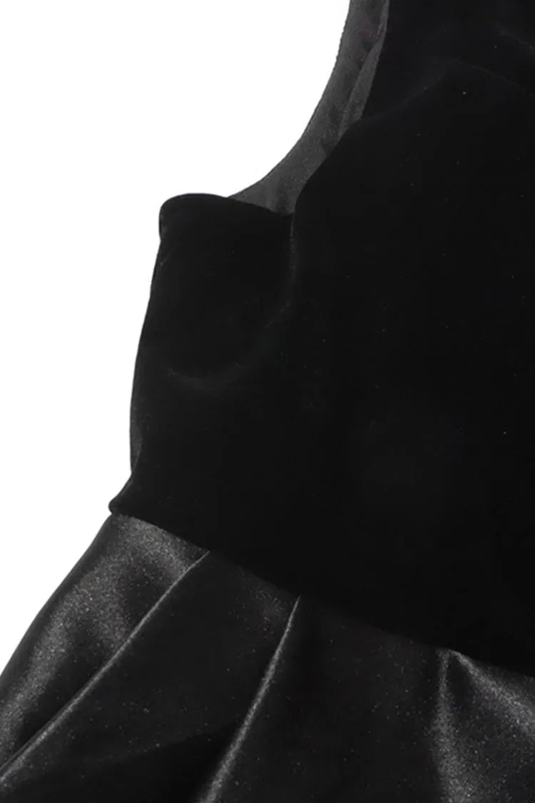 Luxe A-line evening dress blends retro sophistication with textural contrast: crafted from black velvet (bodice) and glossy satin (skirt), it features a deep V-neckline, sleeveless structured shoulders, and a voluminous midi-length skirt. The velvet adds rich depth, while the satin lends sleek movement.