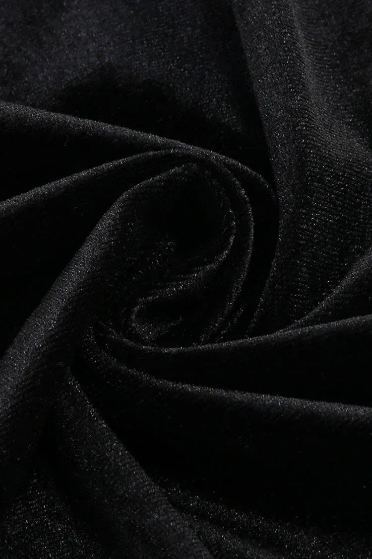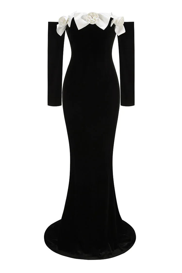 Luxe Mermaid Off-Shoulder Long-Sleeve Floral-Trimmed Velvet Black Maxi Evening Dress for Women