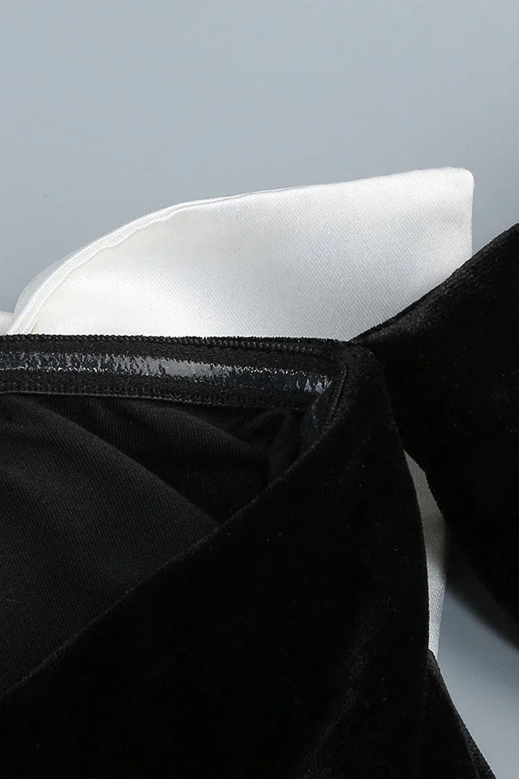 Luxe mermaid evening dress blends opulent texture with romantic detail: crafted from plush black velvet, it features an off-shoulder neckline (adorned with white floral-ribbon trim), form-fitting long sleeves, a figure-hugging bodice, and a floor-length mermaid skirt with a sweeping train. The velvet’s rich sheen adds timeless sophistication, while the white floral trim creates a striking, elegant contrast.