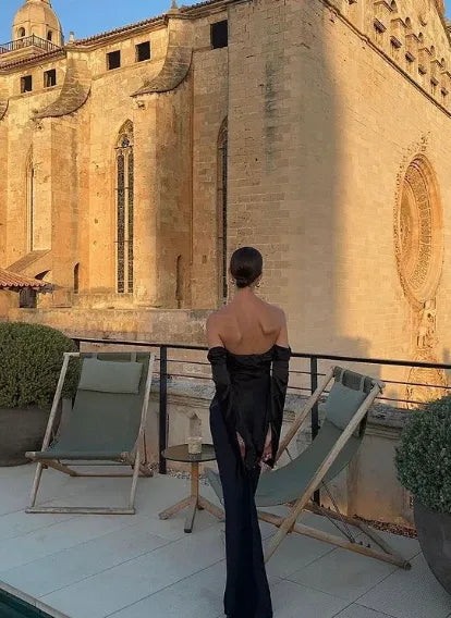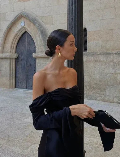 Luxe sheath evening dress blends sleek sophistication with sumptuous texture: crafted from plush black velvet, it features an off-shoulder neckline, dramatic long sleeves (with relaxed drape), a form-fitting bodice, and a floor-length silhouette with a low open back. The velvet’s rich sheen adds timeless elegance, while the open back lends subtle allure.