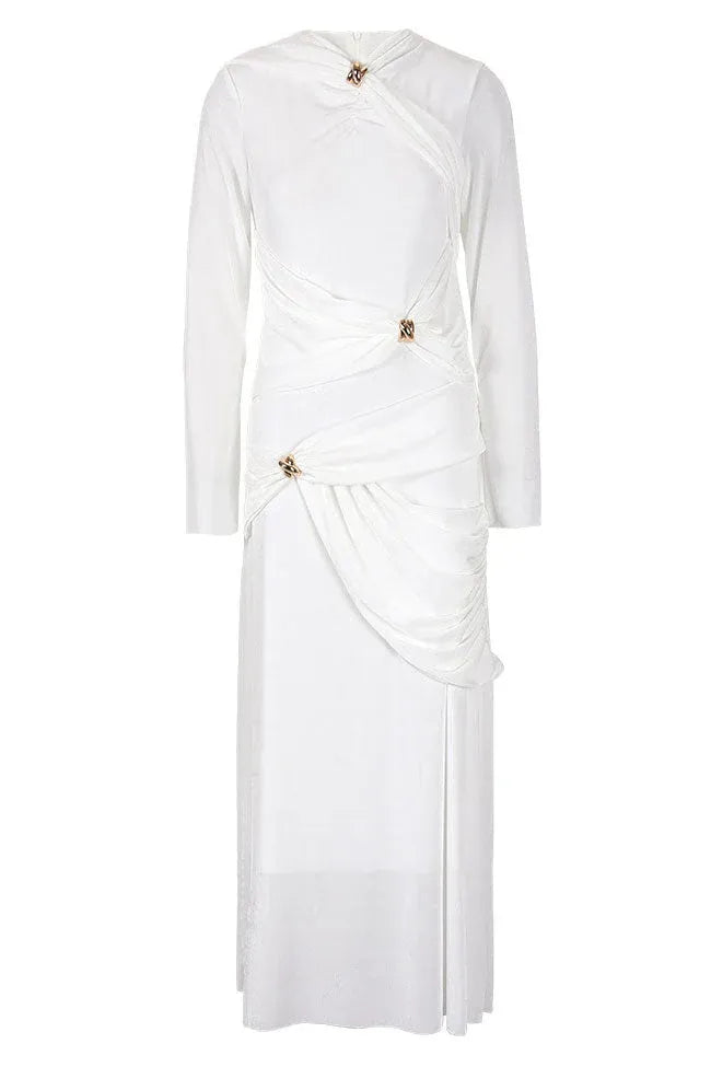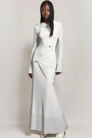 Modern mermaid evening dress blends minimalist elegance with artistic detail: crafted from smooth white fabric, it features a mandarin collar (with a draped overlay), long fitted sleeves (flared at cuffs), ruched panels (accents with metallic fasteners), and a floor-length mermaid skirt. The structured draping adds visual interest, while the white hue feels crisp yet sophisticated.