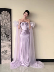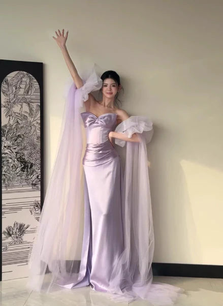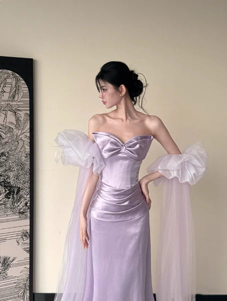 Modest Sheath Strapless Satin Lavender Evening Dress Graduation Dress is a captivating choice. It features a sheath silhouette that hugs the body gracefully, a strapless neckline with a charming bow detail, and is crafted from luxurious satin in a soft lavender hue. The dress is complemented by dramatic tulle sleeves and a flowing train, adding a touch of elegance and ethereal charm.