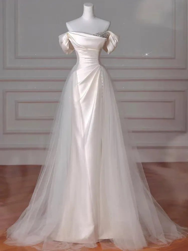 Regal Ivory Evening Dress features a voluminous ballgown silhouette, an off-shoulder neckline with puff sleeves, and a satin bodice (adorned with beaded details for subtle sparkle). The floor-length tulle skirt adds ethereal movement, while the lace-up back ensures a tailored fit.