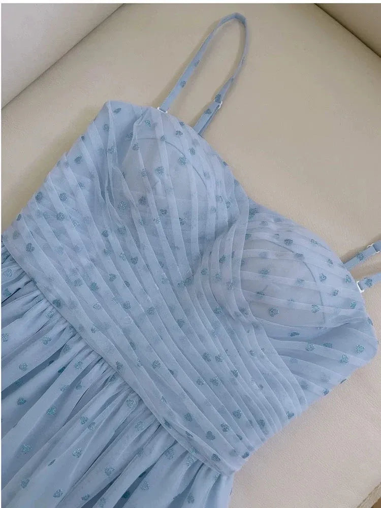 Whimsical Sky Blue Evening Dress features a flowing A-line silhouette, a sweetheart neckline with adjustable spaghetti straps, and sheer tulle fabric (adorned with delicate heart prints that catch light softly). The ruched bodice adds subtle structure, while the maxi-length skirt drapes with airy movement.
