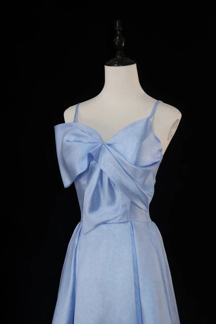 Embrace timeless elegance with this Satin Blue A-Line Prom Dress—a refined showstopper for special occasions. Its delicate spaghetti straps frame a sweetheart neckline, elevated by a dramatic oversized satin bow that adds romantic charm. The bodice features a back lace-up detail for a customizable, flattering fit, flowing into a floor-length A-line skirt: luxe satin fabric drapes smoothly, catching light with a subtle sheen that balances sophistication and softness.
