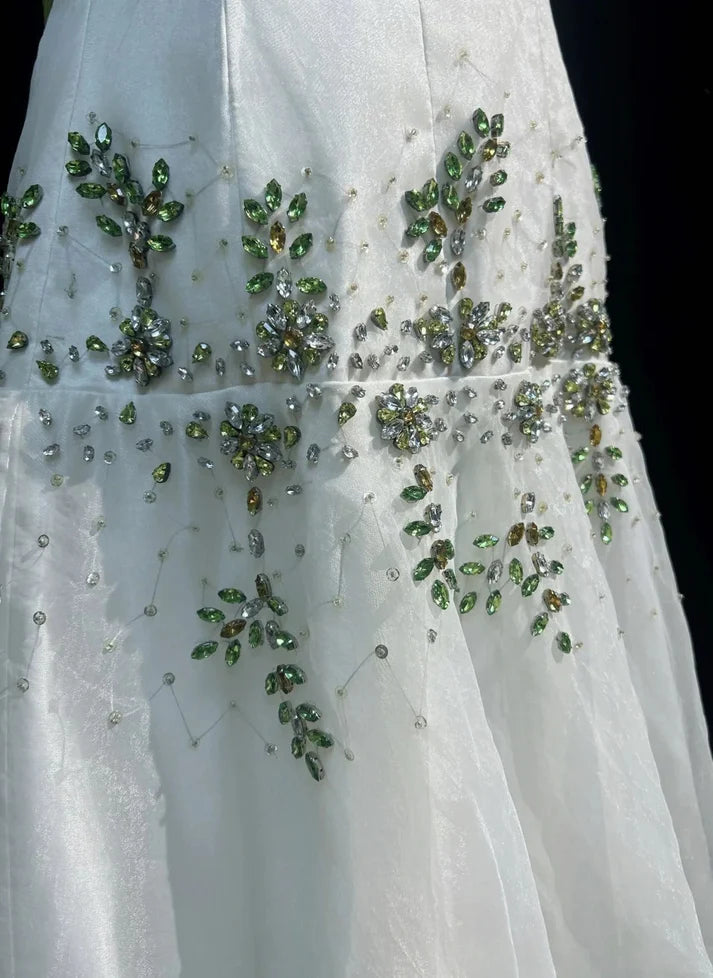 Exquisite Light Green Short Party Dress blends fresh elegance with delicate glamour, crafted from sheer white fabric accented with soft light green details. It features thin spaghetti straps, a V-neckline, and a flowing A-line silhouette—adorned with a 3D fabric rosette and matching sash (adding romantic texture). The lace hem and scattered beading catch light beautifully, while a lace-up back ensures a custom fit.