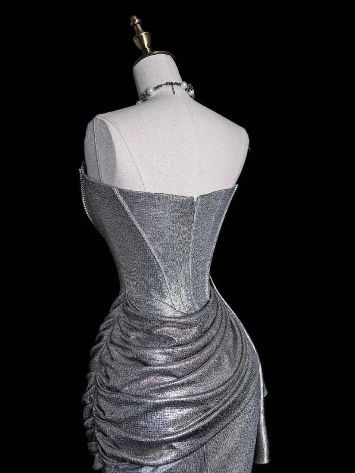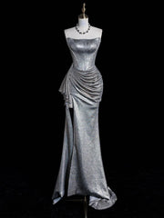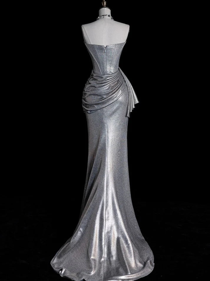 Gorgeous Sheath Strapless Pleated Silver Long Party Dress Prom Dress is a stunning fusion of modern elegance and glamour. It features a strapless neckline, intricate pleated detailing, a sheath silhouette, and is crafted from shimmering silver fabric. The daring side slit and flowing train add touches of allure, while the metallic fabric creates a red-carpet-worthy, sleek presence.