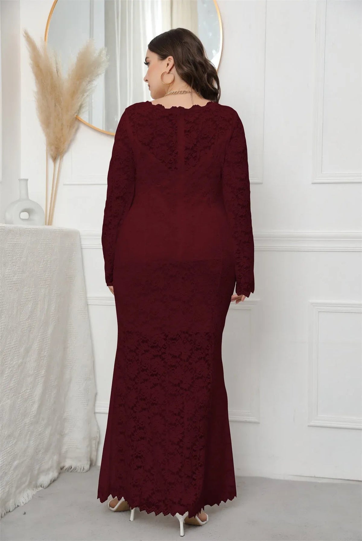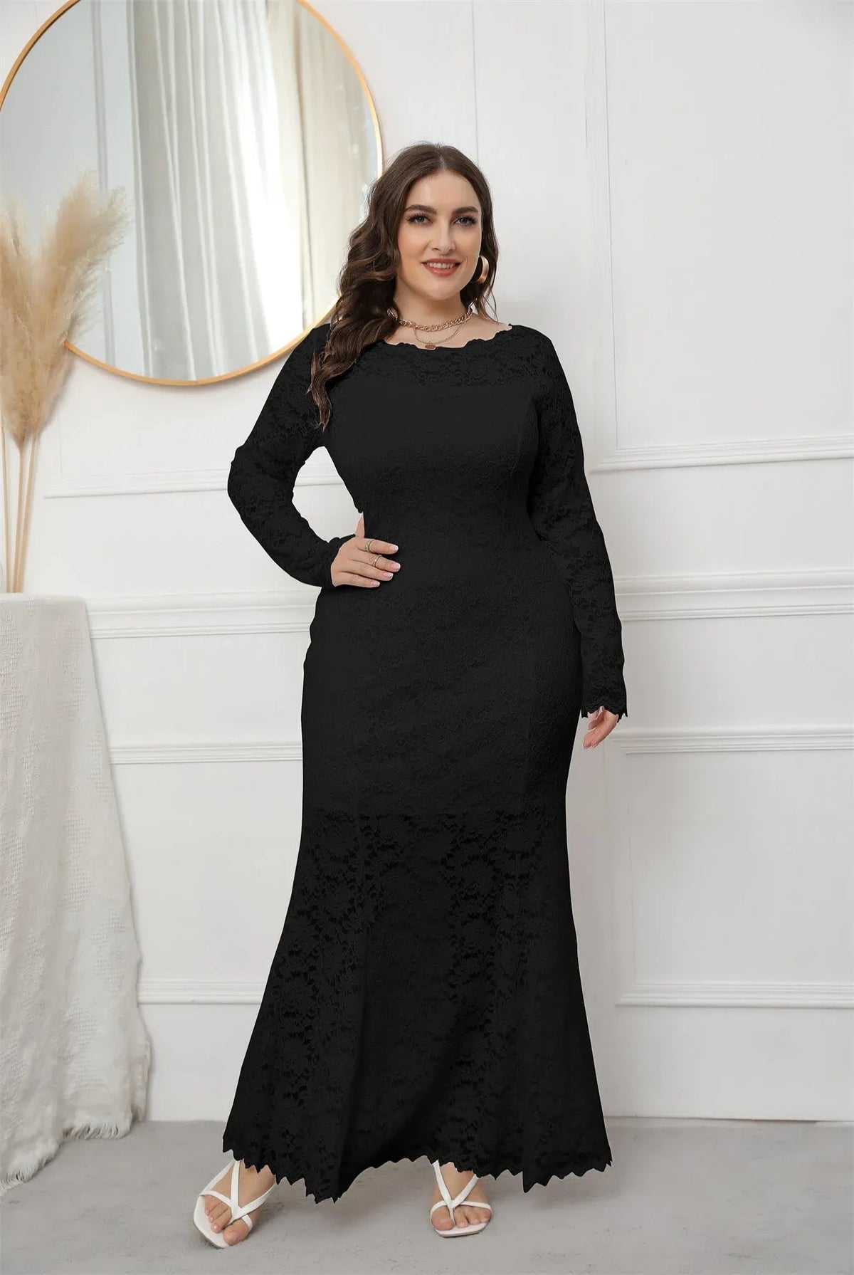 Elegant plus-size prom dress features a figure-flattering mermaid silhouette crafted from intricate floral lace, merging timeless charm with comfortable structure. The crew neckline offers polished coverage, while long lace sleeves add soft elegance—perfect for cooler events. The semi-sheer lace skirt balances sophistication with subtle allure, and the tailored fit skims curves seamlessly.
