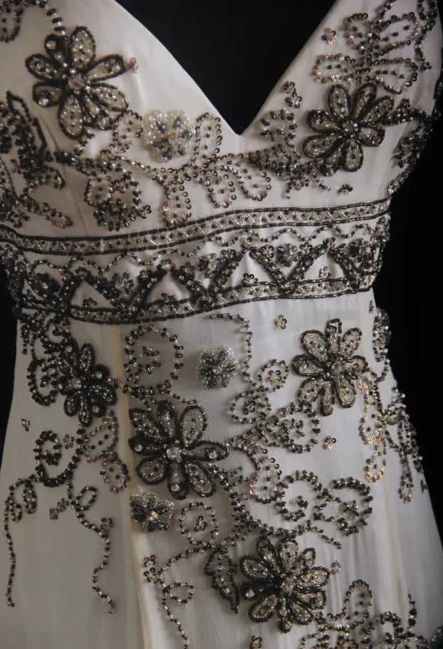 Elegant mermaid prom dress in ivory chiffon is a masterpiece of timeless luxury. It features a plunging V-neckline and a dramatic low V-back, both framed by intricate hand-sewn beading and floral embroidery in a rich, dark bronze tone. The sleeveless design and figure-hugging bodice highlight your curves, while a beaded waistband cinches your silhouette and flows into a floor-grazing maxi skirt with a subtle side slit for ease of movement. The delicate floral beading cascades down one side, adding a romantic, artisanal touch.