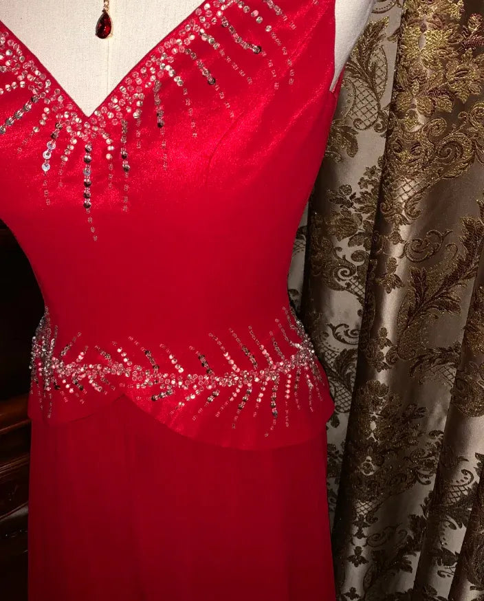 Elegant Mermaid V-Neck Sleeveless Beaded Red Maxi Prom Dress for Women ready to ship - US 2 / UK 6 / EU 32