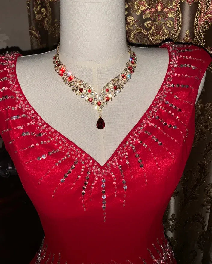 Elegant Mermaid V-Neck Sleeveless Beaded Red Maxi Prom Dress for Women ready to ship