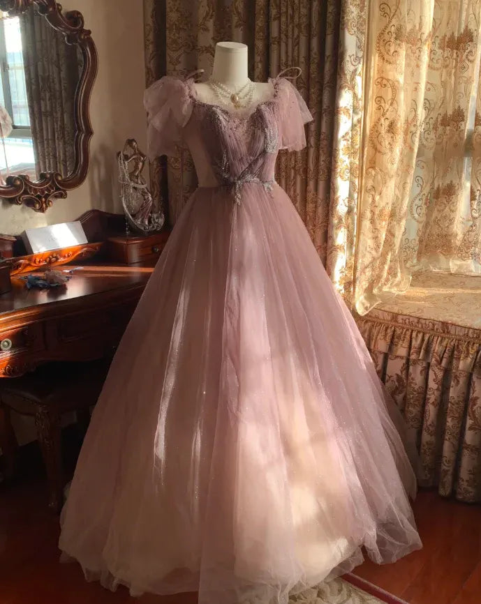 Enchanting Ballgown Prom Dress features a sweetheart neckline framed by delicate, sheer flutter sleeves, and a bodice adorned with hand-sewn beading and crystal embellishments that catch light with every movement. The voluminous floor-grazing tulle skirt is layered with shimmering dusty rose fabric, creating a fairy-tale silhouette that floats gracefully with each step. A subtle beaded waistband cinches your figure, enhancing the romantic, ethereal look.
