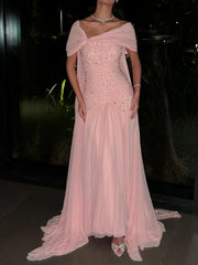 Ethereal A-line prom dress in flowy blush pink chiffon blends dreamy romance with modern elegance. It features an asymmetric off-the-shoulder neckline and dramatic cape-style sleeves that drape gracefully, creating a soft, angelic silhouette. The ruched bodice is adorned with hand-stitched silver beads that catch the light, while the floor-grazing maxi skirt with a delicate train flows dramatically with every step. The lightweight, breathable chiffon fabric ensures comfort, and the soft blush hue exudes femininity and warmth.