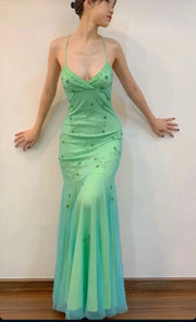 Ethereal Mermaid Halter Neck Sleeveless Embellished Ombre Green Maxi Prom Dress for Women Hot Sale