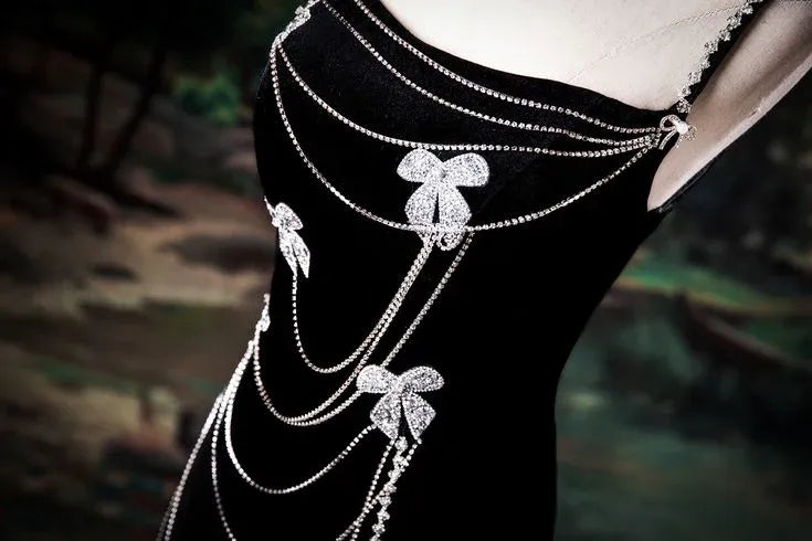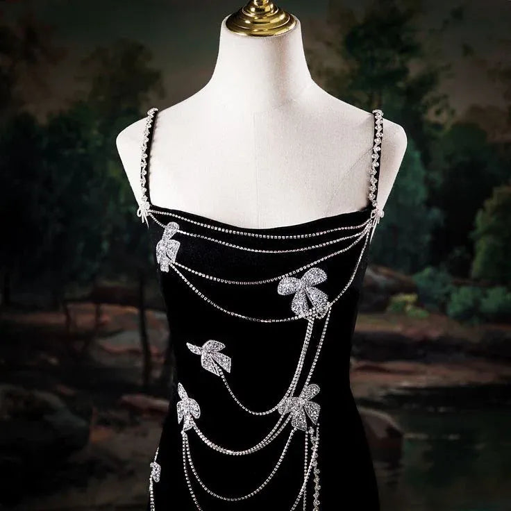 Gothic Column Prom Dress features a strapless, structured bodice crafted from luxurious black velvet, adorned with cascading silver chains and 3D floral appliqués for a dramatic, romantic edge. The floor-grazing column silhouette creates an elongated, modern line, while a lace-up back closure ensures a tailored fit. The plush velvet fabric offers rich texture and warmth, making it ideal for cooler-weather events.