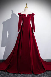 Romantic A-line Off-the-Shoulder Long-Sleeve Ruffle-Accented Burgundy Maxi Prom Dress for Women Custom
