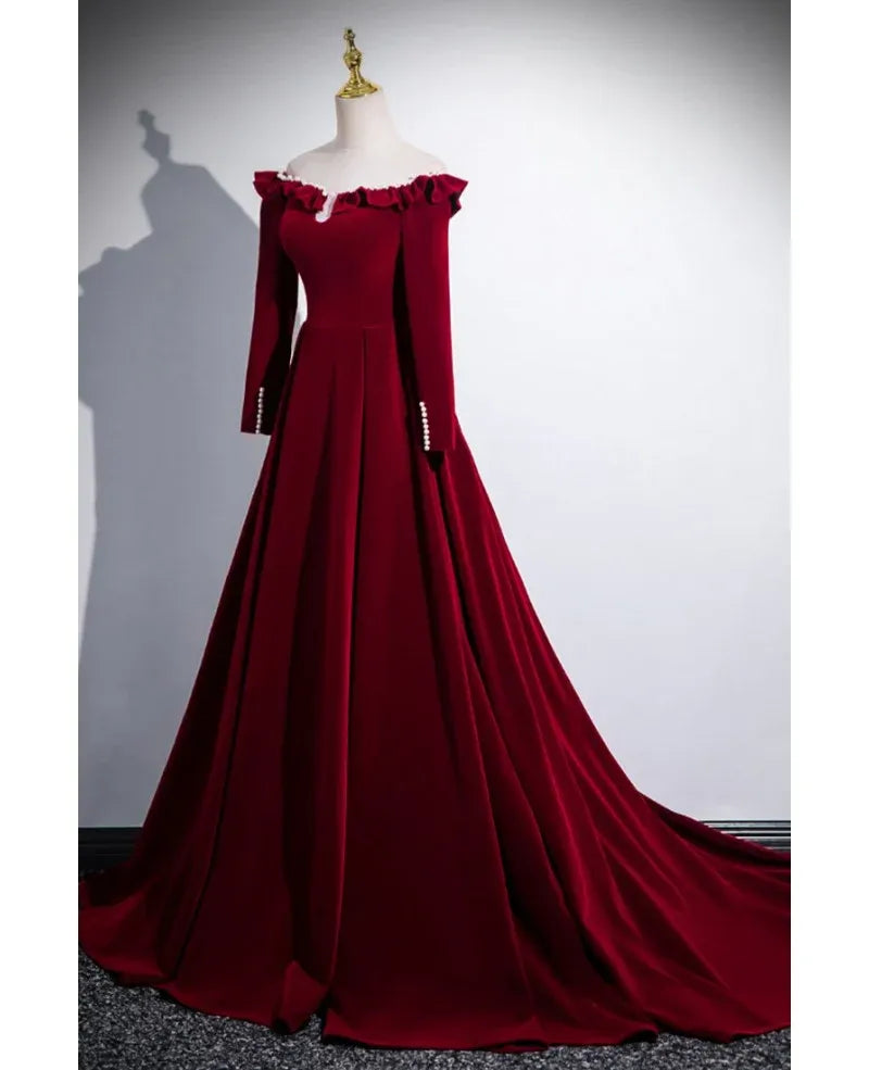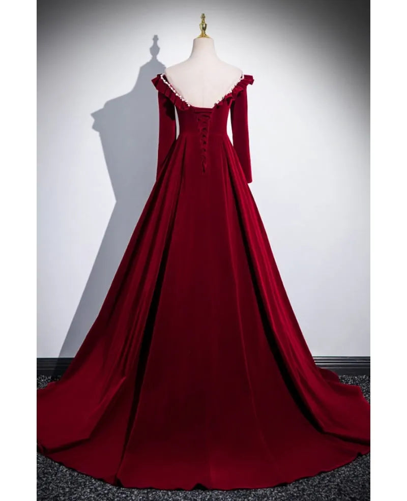 Romantic A-line Prom Dress blends luxe burgundy velvet with vintage-inspired details: its off-the-shoulder neckline features a ruffled trim (with a subtle keyhole cutout), paired with long sleeves accented by delicate pearl buttons. The fabric flows into a voluminous maxi skirt with a sweeping train for graceful movement, while the lace-up back ensures a tailored fit.