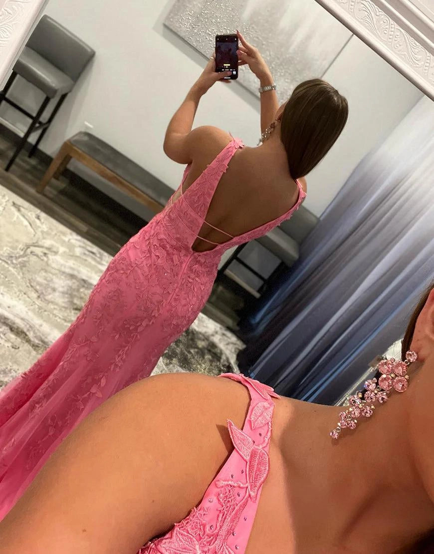 Sexy mermaid-style prom dress in pink is absolutely captivating. It features a deep V-neck that adds a touch of allure, while the intricate appliques and rhinestones on the bodice bring an elegant and sparkling look. The mermaid silhouette hugs your curves perfectly and flares out at the bottom, creating a dramatic and feminine effect. The open back with delicate straps adds another layer of charm.