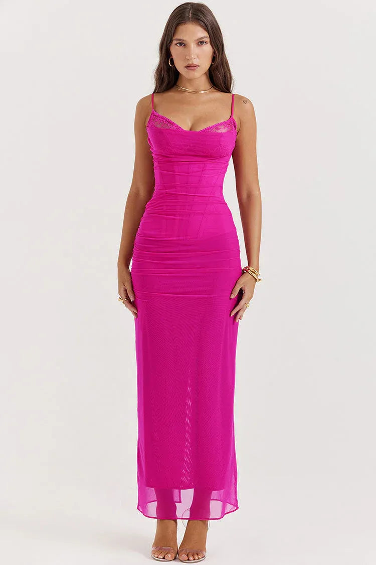 Vibrant Sheath Prom Dress blends lightweight mesh with playful details: its cowl-neck bodice features delicate lace trim and spaghetti straps, while the all-over ruched texture hugs the silhouette into a flowing maxi hem with a subtle back slit. The bold fuchsia hue commands attention, balancing vibrant energy with soft femininity.